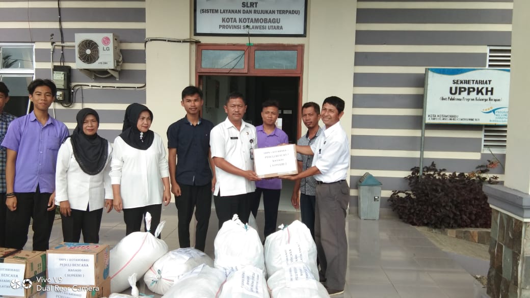 Menerima sumbangan dari SMPN 1 Kotamobagu untuk korban banjir dan tanah longsor di Manado